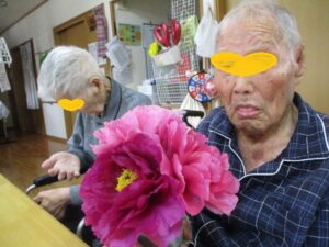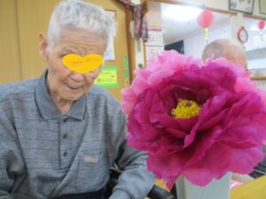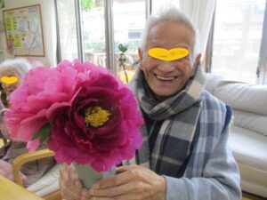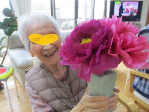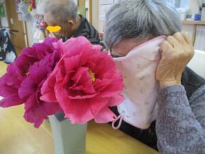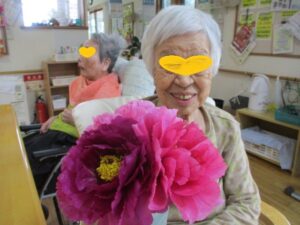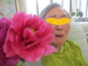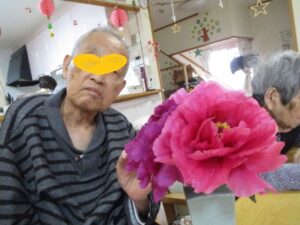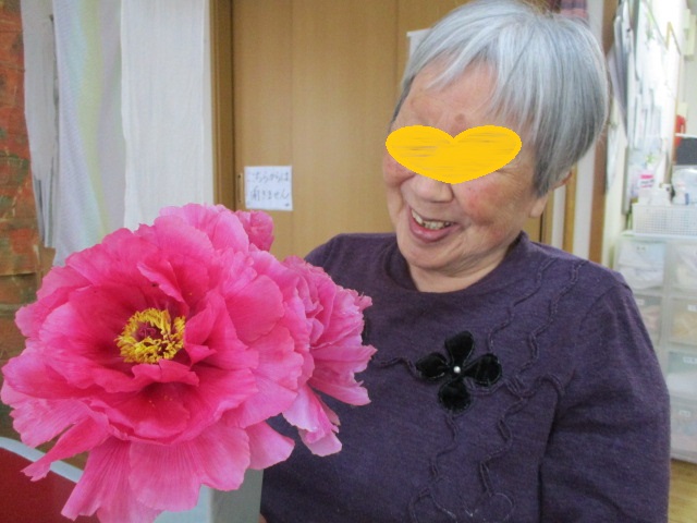 スタッフが庭に咲いた牡丹の花を