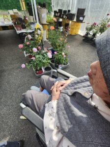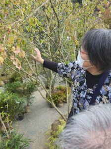 (職員Dが利用者様に植木の話をしています。利用者様も説明をじっと聞かれていました。)