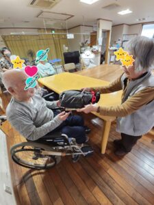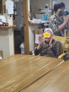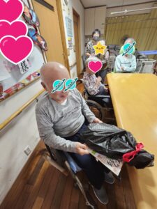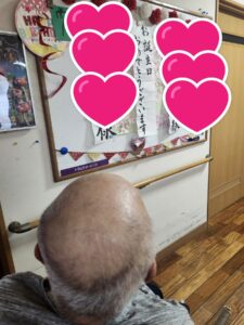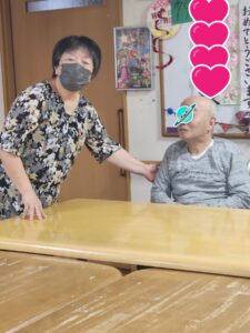 (「〇〇さん、おめでとうございます」と言いながらプレゼントを渡され、「おお、ありがとう」と照れたように返事をされる主役の男性利用者様。)