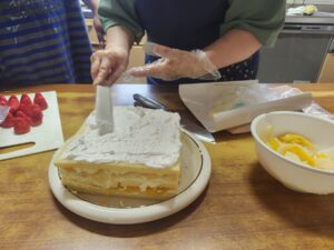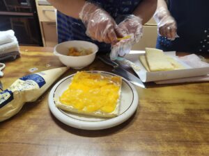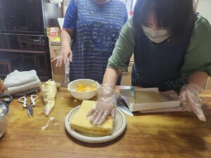 (黄桃を乗せて、上に再びのスポンジ。職員Bが若干ぎゅうっとスポンジを押さえつけています。気持ちは分かる、ズレたら困るもんね!)