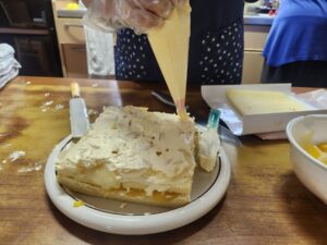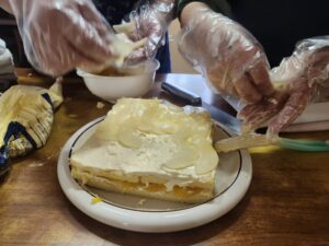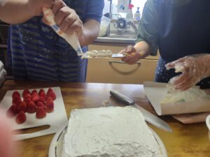(完成は目前!三段目に綺麗にクリームを塗ります!ケーキの側面は私と職員Bの共同作業です!)