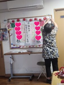 (主役お二人に壁面を見ていただきます。「今日は誰の誕生会?」と聞くとお二人とも嬉しそうです。)