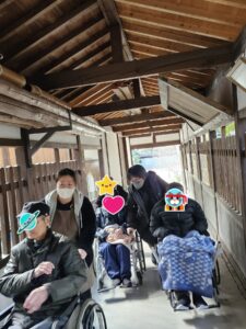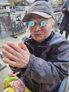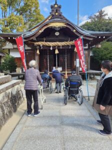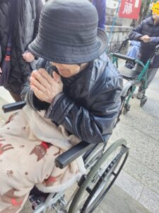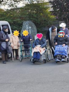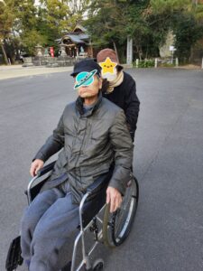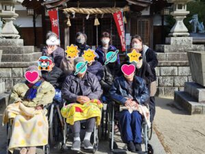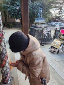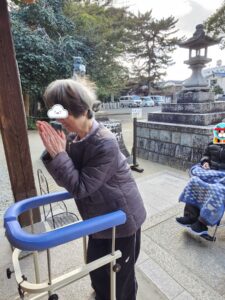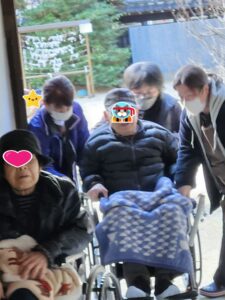 (「お参りするの?」と興味津々な利用者様。一年の健康をお祈りします。)