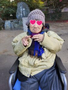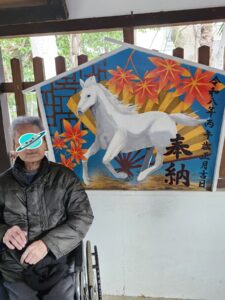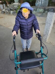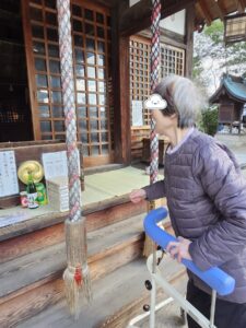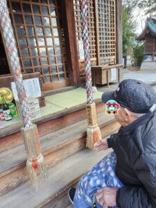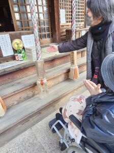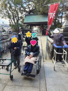 (「お参りするの?」と興味津々な利用者様。一年の健康をお祈りします。)