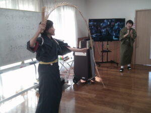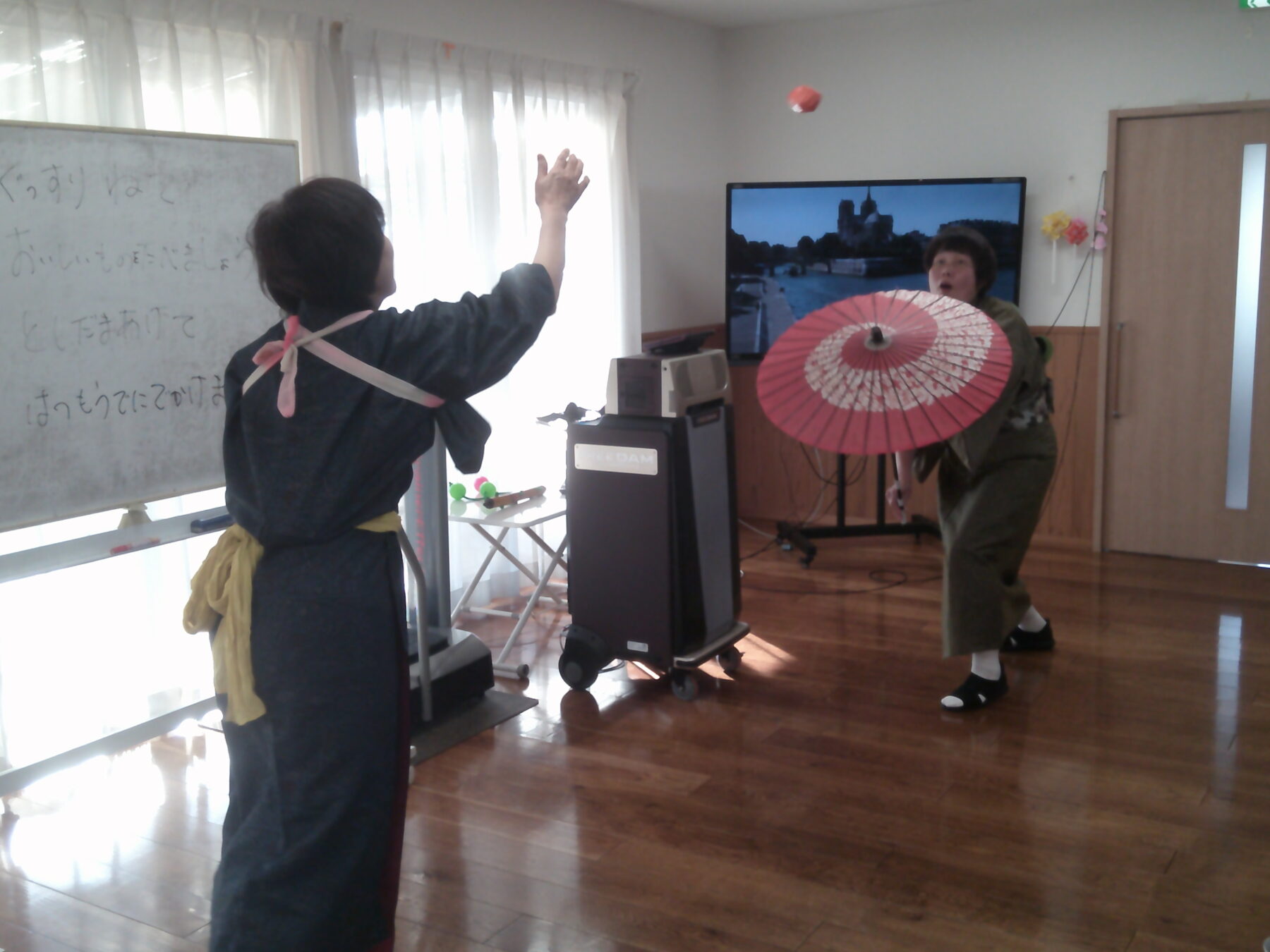 『おめでとうございまーす』の掛け声とともに、傘回し!大うけです。